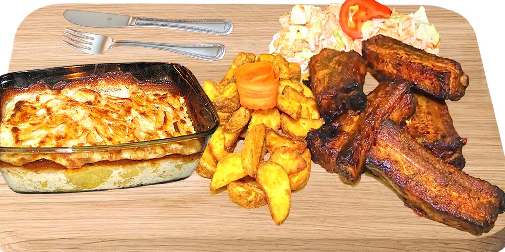 Smag vores lækre Country Style Pork Ribs med hjemmelavet Coleslaw, Cremede Flødekartofler, Krydderkartofler, Agurkesalat, Chips, Ketchup, Mayo