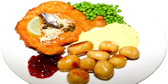 Paneret schnitzel 220g med ovnristede kartofler og Bearnaisesovs. Tilbehør: Ansjosfilet, Peberrod, kapers, Citron, Dampede Ærter, Tyttebær, Chips